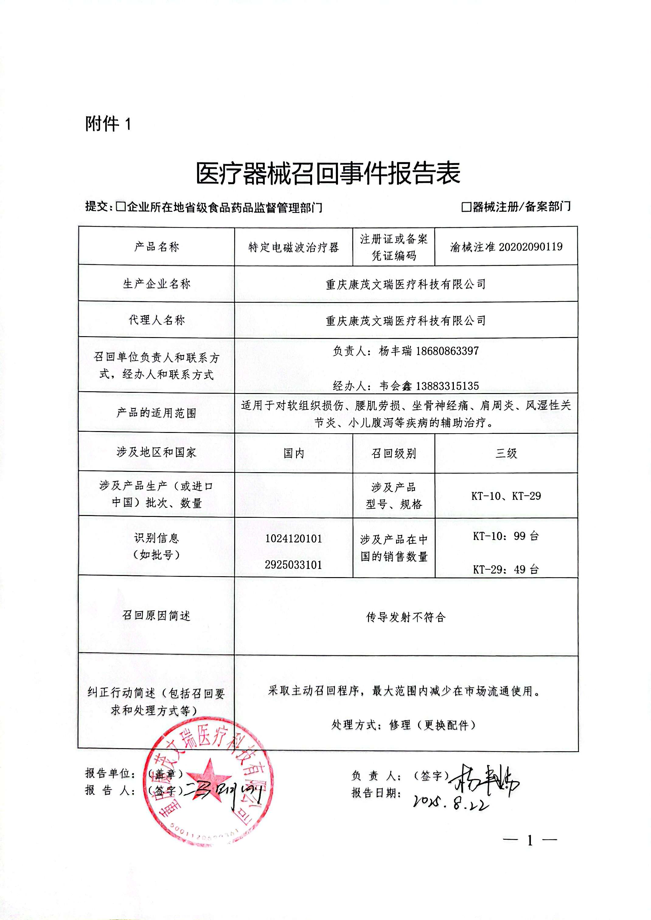 重庆康茂文瑞医疗科技有限公司对特定电磁波治疗器主动召回