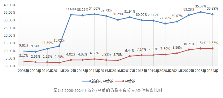 2024年我中心收到新的和严重药品不良反应/事件报告15474份,占同期报告总数的33.89%。收到严重药品不良反应/事件报告5184份,占同期报告数的11.35%。详见图1-2。
