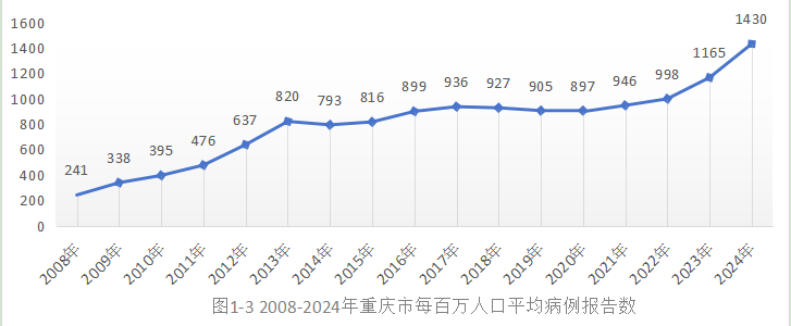 百万人口报告数是衡量一个国家或地区药品不良反应监测工作水平的重要指标之一。2024年重庆市每百万人口平均报告数为1430份,与去年相比增长明显。详见图1-3。