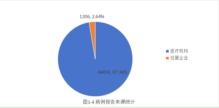 2024年重庆市药品不良反应/事件报告按照来源统计,来自医疗机构的44454份,占报告总数97.36%,医疗机构为报告主要来源;经营企业报告1206份,占报告总数的2.64%。详见图1-4。