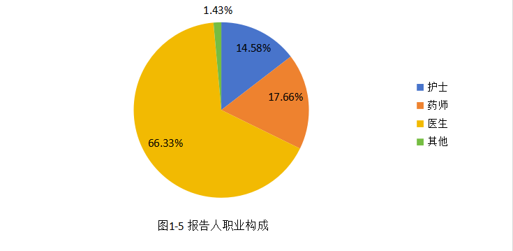 2024年药品不良反应/事件报告按照报告人职业统计,医生报告30288例,占66.33%;药师报告8065例,占17.66%;6655例,占14.58%;其他报告652例,占1.43%。与2023年相比,报告人职业构成基本相同,详见图1-5。