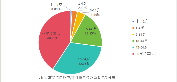 2024年药品不良反应/事件报告中,男性和女性患者比例为0.81:1,比例较去年无明显变化。14岁及以下儿童患者的报告占7.89%,65岁及以上老年患者的报告占40.79%,详见图1-6。
