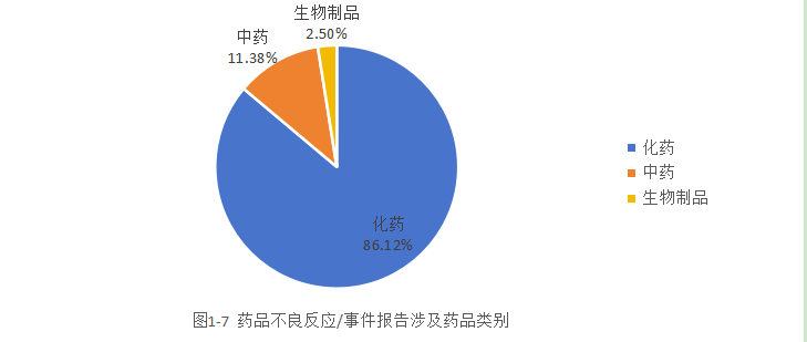 按照怀疑药品类别统计共涉及2103个品种,其中化学药占86.12%,涉及1164个品种;中成药占11.38%,涉及824个品种;生物制品占2.50%,涉及115个品种,详见图1-7。