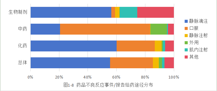 按照给药途径统计,2024年药品不良反应/事件报告中,以静脉滴注给药为主,占55.40%;之后分别是口服给药29.95%,静脉注射给药4.21%,外用给药2.11%,肌内注射给药1.77%,其它给药途径为6.56%,详见图1-8。