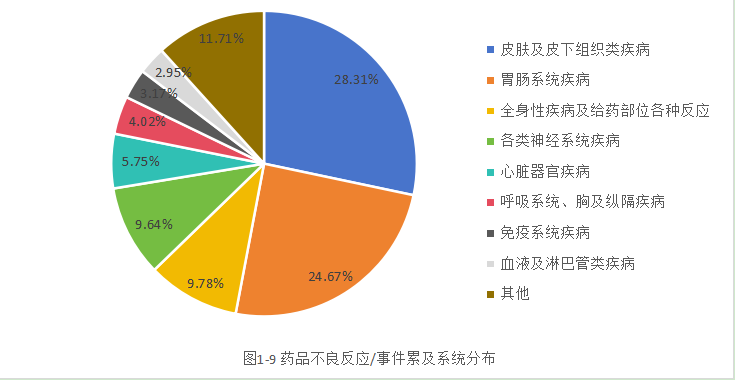 2024年报告的药品不良反应/事件中,皮肤及皮下组织类疾病(占28.31%)、胃肠系统疾病(占24.67%)占比仍远高于其它系统疾病,全身性疾病及给药部位各种反应(占9.78%)占比上升到第三位。详见图1-9。